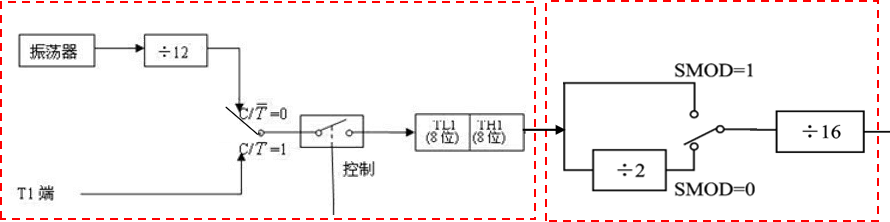 T1溢出脉冲有两种分频路径:16分频或32分频;